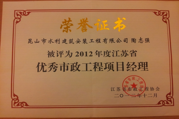 我公司项目经理陶志强被评为2012年度江苏省优秀市政工程项目经理。