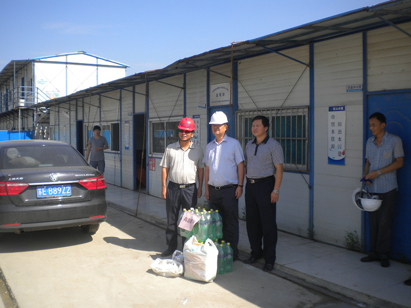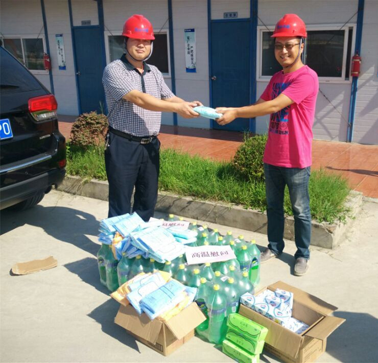 2015年7、8月高温天连续不断,超过十多天连续最高温度35℃以上,水利局及水建公司一行人员向一线职工赠送防暑降温用品,保障高温作业职工身体健康,督促项目部落实防暑降温相关政策规定,根据夏季高温特点,调整高温作业工时,实施高温错时作业,改善高温作业职工劳动条件,重点关注现场施工人员的生产生活环境。