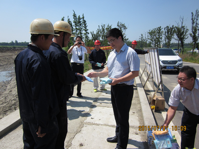 昆山市水利局局长景局一行人向南部水乡三期一标现场施工人员分发防暑用品: