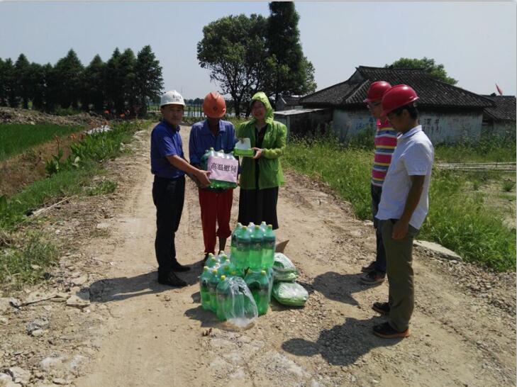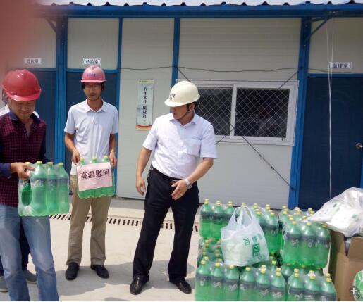 渐入盛夏,烈日炎炎,热浪滚滚,节节攀升的气温让所有人都体会到了骄阳的“威力”。对于坚守工地一线岗位的员工,连续的高温也牵动着水建公司各层领导的心。为将水建公司的关怀和慰问及时传递给每一位员工,7月25日,水建公司领导驱车赶赴各工程工地,向奋战在一线的员工们送去慰问,并将公司准备的毛巾、饮料、风油精等高温慰问品送到员工手中,让员工们在酷暑中感受到了一丝舒心的凉意。在公司领导询问了员工的排班后,在鼓励大家克服高温困难、积极完成工作的同时要求各项目负责人做好关爱员工工作,适时调整工作时间,避免公司职工及务工人员发生中暑现象,同时不放松安全生产,杜绝安全事故发生。