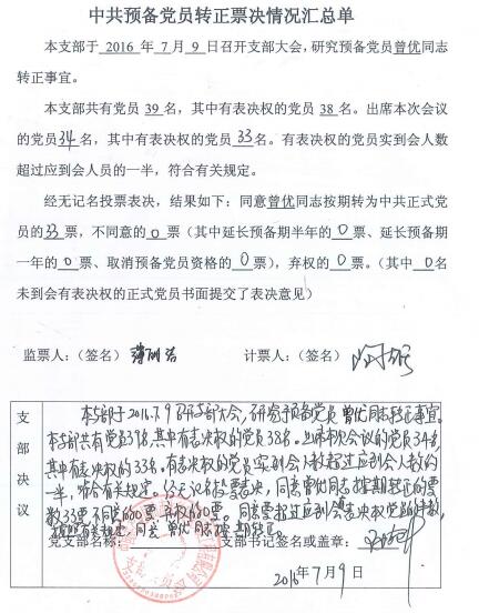 2016年7月9日召开支部大会,全体党员参加了会议,本次会议共有四个议程:一、按昆山市委组织部昆组通[2016]31号文“爱体育中国体育官方网站组织开展2016年“党章学习日”活动的通知”精神:1、以党支部为单位组织党员原原本本学习党章,支部书记上党课;2、组织全体党员普遍开展一次重温入党誓词活动。3、开展主题实践活动:至少要开展一次党员志愿服务,在职党员进社区,在职党员年初已全部进社区报到。上月我支部全体在职党员均自愿参与了“党员关受基金”“阜宁振灾捐款”的捐款活动,共计金额为2300元和2500元。二、按水利局党委昆水党[2016]7号文《爱体育中国体育官方网站在水利系统党员中开展“学党章党规、学系列讲话,做合格党员”学习教育的实施方案》的通知精神要求,2016年5月30日我支部发了爱体育中国体育官方网站“两学一做学习教育实施方案” 的通知,1、要求每名在职党员要认真学习文件精神,利用业余、休息时间进行全面地、系统地学习党章、党规、学系列讲话、学习《准则》《条例》,学习完成后结合自己的实际工作情况写一篇学习体会(可以打印,签名必须手签),于6月底前上交支部,年底将评选出几名优秀学习心得者;2、我支部结合公司的岗位不同的实际情况不同,设立了三个“党员示范岗”:综合业务部、检测科一室、苏州高新区水环境整治六标项目部,希望各位党员向他们看齐,立足本职、尽心尽责。3、开拓创新上党课,今天优秀党员、年轻党员两名(邓云泽、曾优)就“两学一做”学习教育心得并联系个人的实际工作给全体党员上一次党课。4、各位党员在完成以上基本任务的情况下,还可以将党员志愿服务与做合格党员结合起来,自愿参加一些党员志愿服务活动上报到支部,将在年底纳入党员考核中。三、讨论、票决预备党员曾优转正事宜
