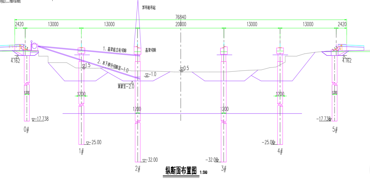 桥梁已建部位全部拆除,目前河底高程桥桩位置中跨▽0.5,边跨▽1.5,拆除工程量包括:1#、2#、3#、4#桥墩共8根水下灌注桩、8根桥墩,1#、2#、3#、4#共4块盖梁、0#、5#共两块桥台。